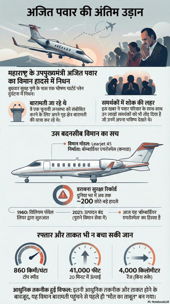 जिस विमान में अजित पवार सवार थे, वह ‘Learjet 45’ मॉडल का बिजनेस जेट था। हालांकि यह जेट अपनी लग्जरी और रफ्तार के लिए जाना जाता है, लेकिन इसका सुरक्षा रिकॉर्ड काफी विवादित रहा है। आंकड़ों के मुताबिक, इस सीरीज के विमानों के साथ वैश्विक स्तर पर लगभग 200 दुर्घटनाएं दर्ज की जा चुकी हैं। कनाडाई कंपनी बॉम्बार्डियर एयरोस्पेस ने 2021 में इनका उत्पादन बंद कर दिया था, फिर भी पुराने मॉडल आज भी सेवा में हैं।