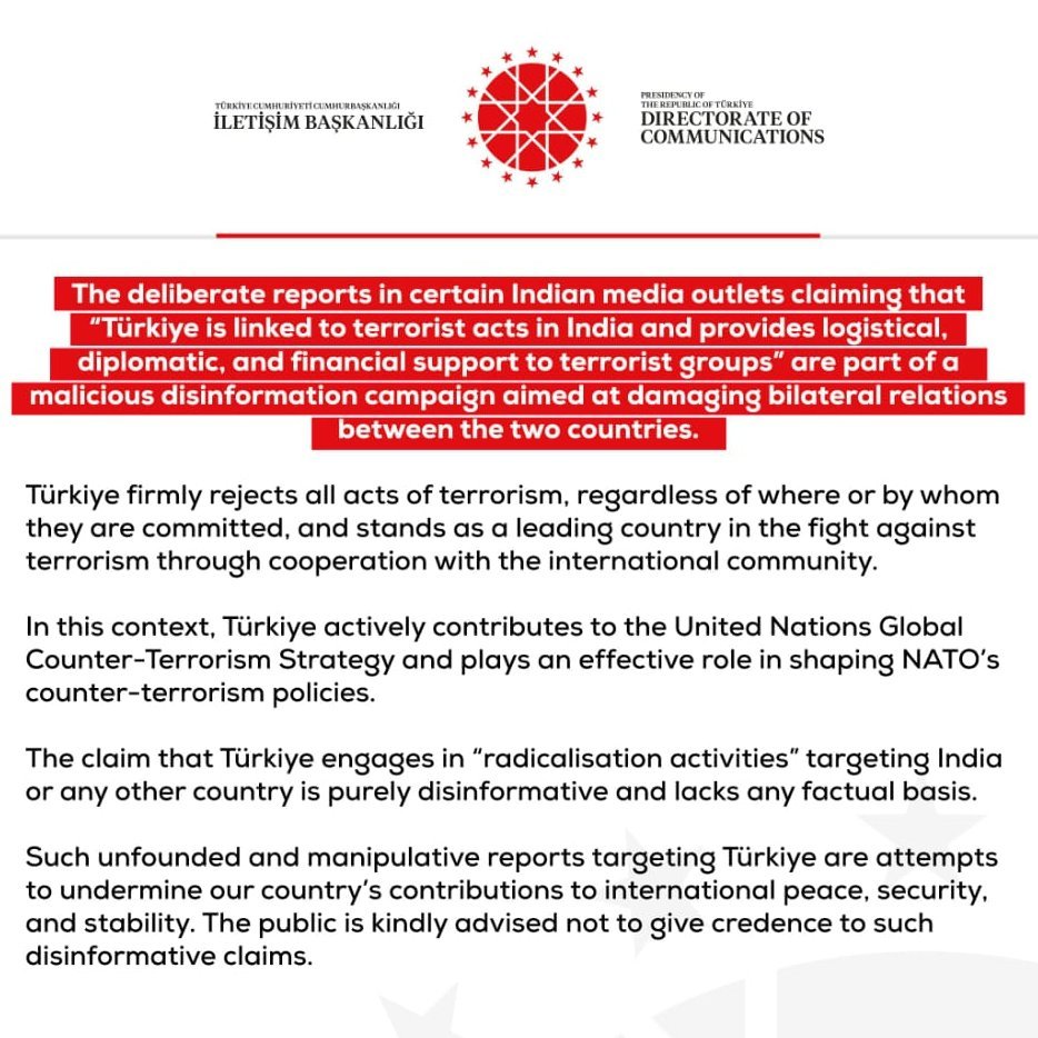 तुर्किये सरकार के संचार विभाग (Turkish government’s communications department) ने बुधवार रात जारी एक बयान में कहा कि कुछ भारतीय मीडिया संस्थानों में यह दावा किया जा रहा है कि “तुर्किये भारत में आतंकवादी गतिविधियों से जुड़ा है और आतंकवादी समूहों को सैन्य, राजनयिक और वित्तीय सहायता प्रदान करता है, जो दोनों देशों के बीच द्विपक्षीय संबंधों को नुकसान पहुँचाने के उद्देश्य से एक दुर्भावनापूर्ण दुष्प्रचार अभियान का हिस्सा है।”