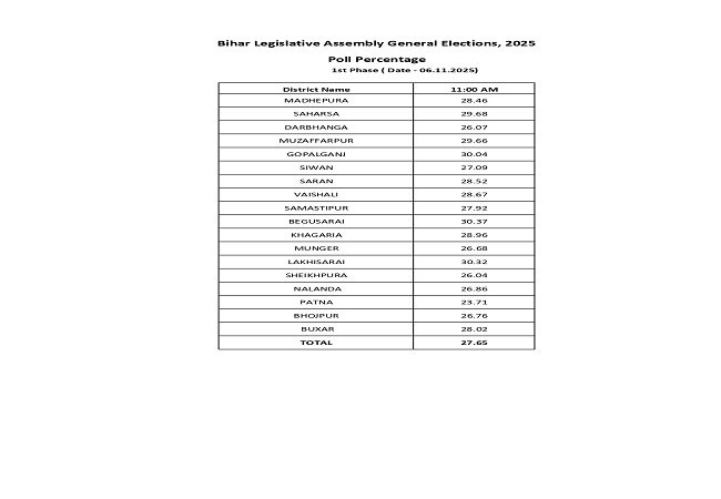 बिहार के 121 विधानसभा क्षेत्रों में सुबह 11 बजे तक 27.65 प्रतिशत मतदान हुआ है। सुबह 11 बजे तक के इस मतदान प्रतिशत ने न सिर्फ 2020 के पहले चरण के मतदान प्रतिशत का रिकॉर्ड तोड़ा है, बल्कि यह 2020 के दूसरे और तीसरे चरण के मतदान प्रतिशत से भी अधिक है। 2020 के विधानसभा के लिए तीन चरण में मतदान हुआ था, जबकि इस बार दो चरण में मतदान हो रहा है।
