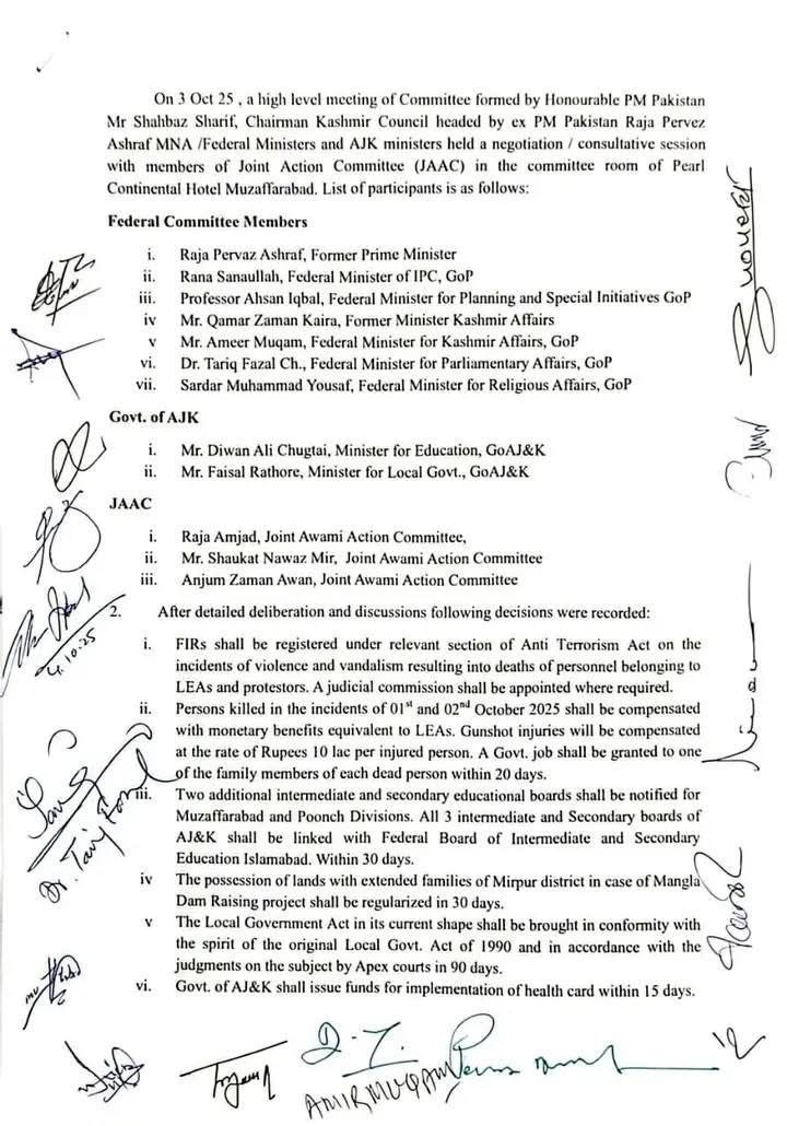 इसके अलावा 01 और 2 अक्टूबर की घटनाओं में मारे गए व्यक्तियों के परिजनों को वही मुआवजा मिलेगा जो सुरक्षा बलों के मामलों में निर्धारित है। गोली लगने से घायल प्रति व्यक्ति को 10 लाख रुपये का मुआवज़ा दिया जाएगा। प्रत्येक मृतक के परिवार के एक सदस्य को 20 दिनों के भीतर सरकारी नौकरी दी जाएगी। इसके अतिरिक्त मुज़फ़्फ़राबाद और पुंछ संभागों में दो नए इंटरमीडिएट और सेकेंडरी शिक्षा बोर्ड (Intermediate and Secondary Education Boards) स्थापित किए जाएंगे। पीओके के तीनों शिक्षा बोर्डों को 30 दिनों के भीतर संघीय इंटरमीडिएट और सेकेंडरी शिक्षा बोर्ड इस्लामाबाद से जोड़ा जाएगा। सरकार 15 दिनों के भीतर स्वास्थ्य कार्ड लागू करने के लिए धन जारी करेगी।