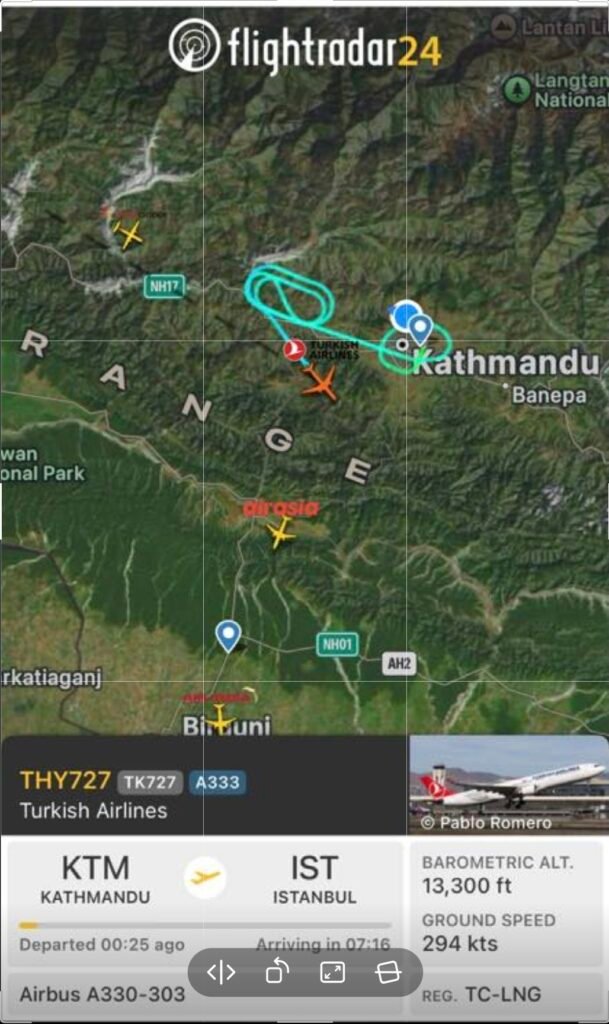 विमानस्थल के महाप्रबंधक टेकनाथ सिटौला (airport’s General Manager, Teknath Sitaula) के अनुसार तुर्किश एयरलाइंस के विमान ने त्रिभुवन अंतरराष्ट्रीय विमानस्थल से बुधवार दोपहर 1:28 बजे उड़ान भरी, लेकिन उड़ान के चार मिनट के भीतर ही तुर्किश विमान के कप्तान ने दाहिने इंजन में आग लगने की सूचना दी। इसके बाद चालक दल ने विमान को पश्चिम दिशा में मोड़ते हुए दाहिना इंजन बंद कर 10 से 12 मिनट तक होल्ड किया। उनके अनुसार तुर्किश एयरलाइंस का यह ए330–303 श्रृंखला का वाइड बॉडी विमान था, जिसमें कुल 225 यात्री सवार (Turkish Airlines A330-303 series wide-body aircraft with a total of 225 passengers on board) थे। दाहिने इंजन में आग लगने की सूचना मिलते ही त्रिभुवन अंतरराष्ट्रीय विमानस्थल को एहतियातन 15 मिनट के लिए पूरी तरह बंद कर दिया गया था।