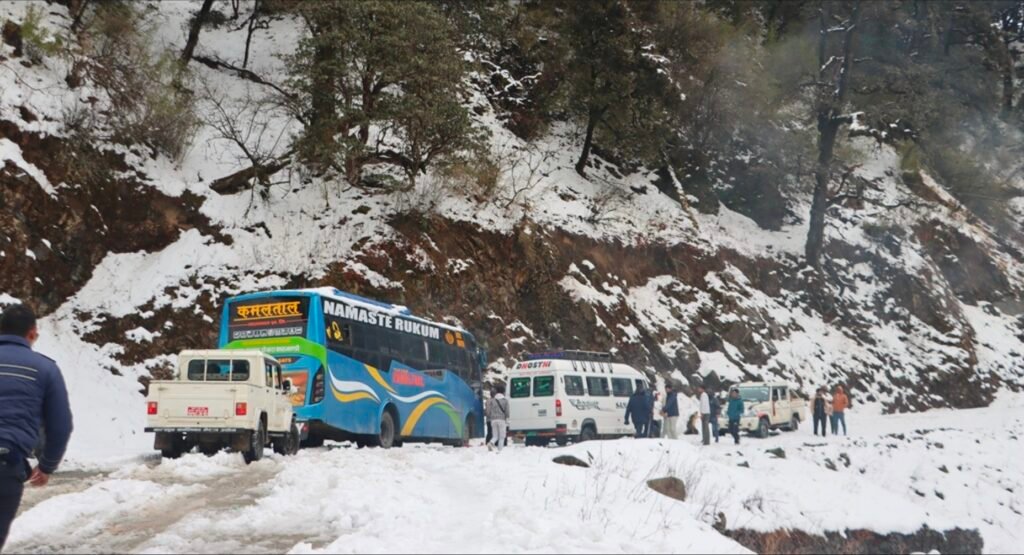 रुकुम पूर्व में भारी हिमपात के चलते मध्यपहाड़ी लोकमार्ग (Mid-Hill Highway) का लुकुम–पातिहाल्ना खंड अवरुद्ध हो गया है। जिला प्रहरी कार्यालय के अनुसार, इस मार्ग पर 7 बसें, 1 जीप और 5 मोटरसाइकिल फंसी हुई हैं, जबकि 250 से अधिक यात्री फंसे पड़े हैं।