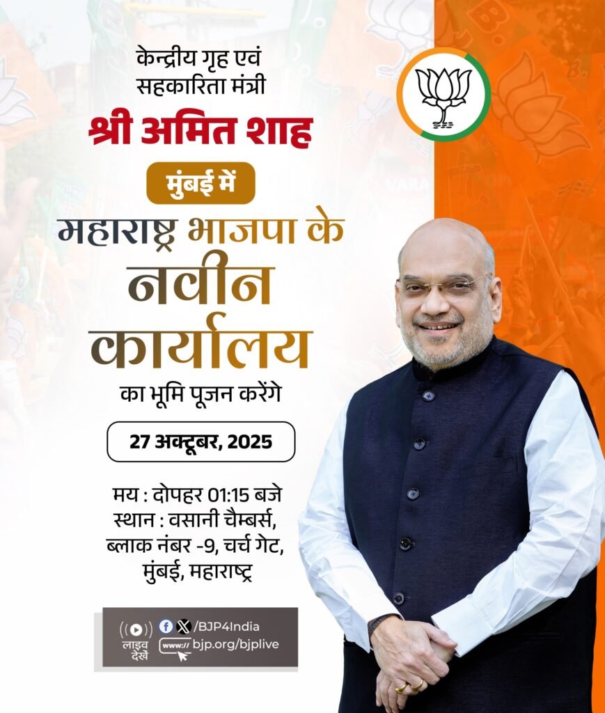 भाजपा एक्स हैंडल पोस्ट के अनुसार, अमित शाह दोपहर सवा एक बजे ऐतिहासिक चर्च गेट के पास ब्लॉक नंबर नौ पहुंचेंगे। वो यहां के वसानी चैंबर्स में महाराष्ट्र भारतीय जनता पार्टी के नए कार्यालय के लिए भूमि भूजन कर निर्माण कार्य का श्रीगणेश कराएंगे।