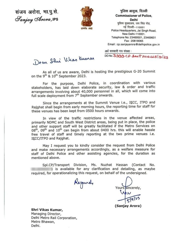 पुलिस कमिश्नर अरोड़ा ने कहा है कि 8, 9 और 10 सितंबर को तीन दिन मेट्रो सुबह 4 बजे से चलाई जाए, जिससे आम लोगों के साथ ड्यूटी पर जानेवाले पुलिसकर्मियों को किसी प्रकार की असुविधा का सामना न करना पड़े। उन्होंने कहा है कि इस दौरान ट्रैफिक रिस्ट्रिक्शन के कारण नई दिल्ली और दक्षिणी पश्चिमी-दिल्ली में परेशानी हो सकती है। इसलिए ऐसा करना जरूरी है, जिससे पुलिसकर्मी समय से पहुंचकर ड्यूटी पर रिपोर्ट कर पाए।