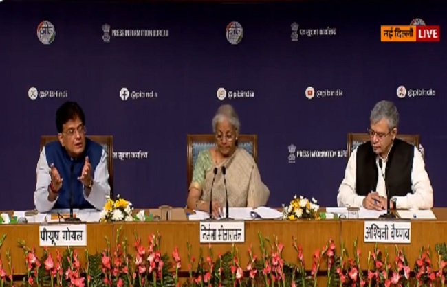 नई वस्तु एवं सेवा कर (Goods and Services Tax) (GST) 2.0 दरें लागू होने के करीब एक महीने बाद वित्त मंत्री सीतारमण, वाणिज्य एवं उद्योग मंत्री पीयूष गोयल और आईटी एवं रेल मंत्री अश्विनी वैष्णव ने धनतेरस पर यहां एक संयुक्त प्रेस कांफ्रेंस को संबोधित कर रहे थे।