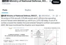 ताइपे (ताइवान) (Taiwan) : चीन ने एकबार फिर ताइवान के आसपास सैन्य गतिविधियां (intensified military activities) तेज कर दी हैं। ताइवान के राष्ट्रीय रक्षा मंत्रालय (Taiwan’s Ministry of National Defense) ने कहा कि उसने शनिवार सुबह 6 बजे (स्थानीय समय) तक ताइवान के आसपास चीन के 14 सैन्य विमानों, नौ नौसैनिक जहाजों और एक आधिकारिक … Continue reading Taiwan : ताइवान के आसपास चीन ने सैन्य हलचल तेज की, नौ विमान एडीआईजेड में घुसे