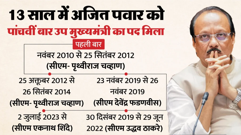 महाराष्ट्र की राजनीति में अजित पवार का कद इस बात से समझा जा सकता है कि वे 13 वर्षों के भीतर पांच बार उपमुख्यमंत्री बने। पृथ्वीराज चव्हाण से लेकर देवेंद्र फडणवीस और एकनाथ शिंदे तक, मुख्यमंत्री चाहे कोई भी रहा हो, ‘दादा’ की उपयोगिता हर सरकार के लिए अपरिहार्य बनी रही। वे राज्य के सबसे लंबे समय तक (गैर-लगातार) इस पद पर रहने वाले नेता थे।