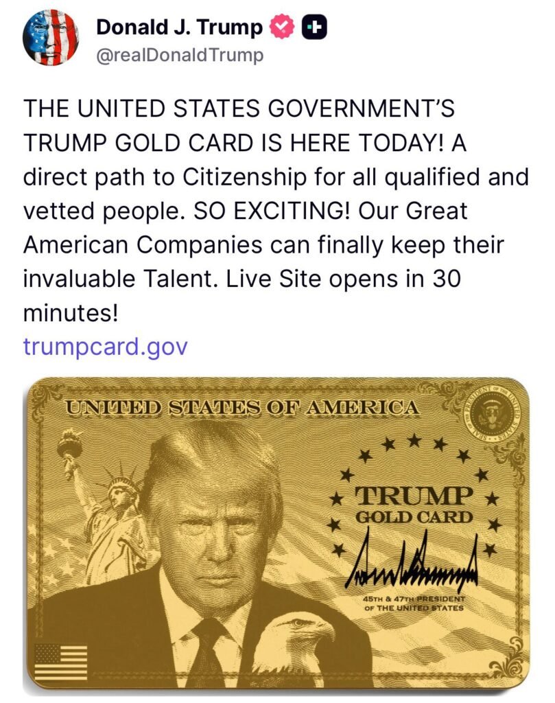 ट्रंप ने वॉइट हाउस के रूजवेल्ट रूम में बिजनेस लीडर्स की मौजूदगी में इस बहुप्रतीक्षित योजना की घोषणा की। उन्होंने ट्रुथ सोशल पर लिखा, ‘अमेरिकी सरकार का ट्रंप गोल्ड कार्ड (Trump Gold Card) आज आ गया। सभी योग्य और वेरिफाइड लोगों के लिए नागरिकता का सीधा रास्ता।अमेरिकी कंपनियां अपनी प्रतिभाओं को अपने पास रख पाएंगी। लाइव साइट 30 मिनट में खुलेगी।’