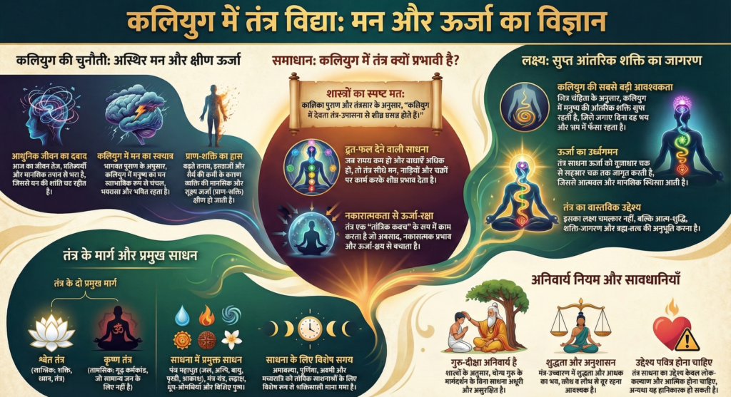 भगवद्गीता (9.1) में श्रीकृष्ण कहते हैं— “राजविद्या राजगुह्यं पवित्रमिदमुत्तमम्।” अर्थात् — यह ज्ञान श्रेष्ठ, पवित्र और गूढ़ है, जो अंततः मोक्ष की ओर ले जाता है। कलियुग में तंत्र विद्या कोई भयावह रहस्य नहीं, बल्कि मन, ऊर्जा और चेतना का वैज्ञानिक संतुलन है। यदि इसे